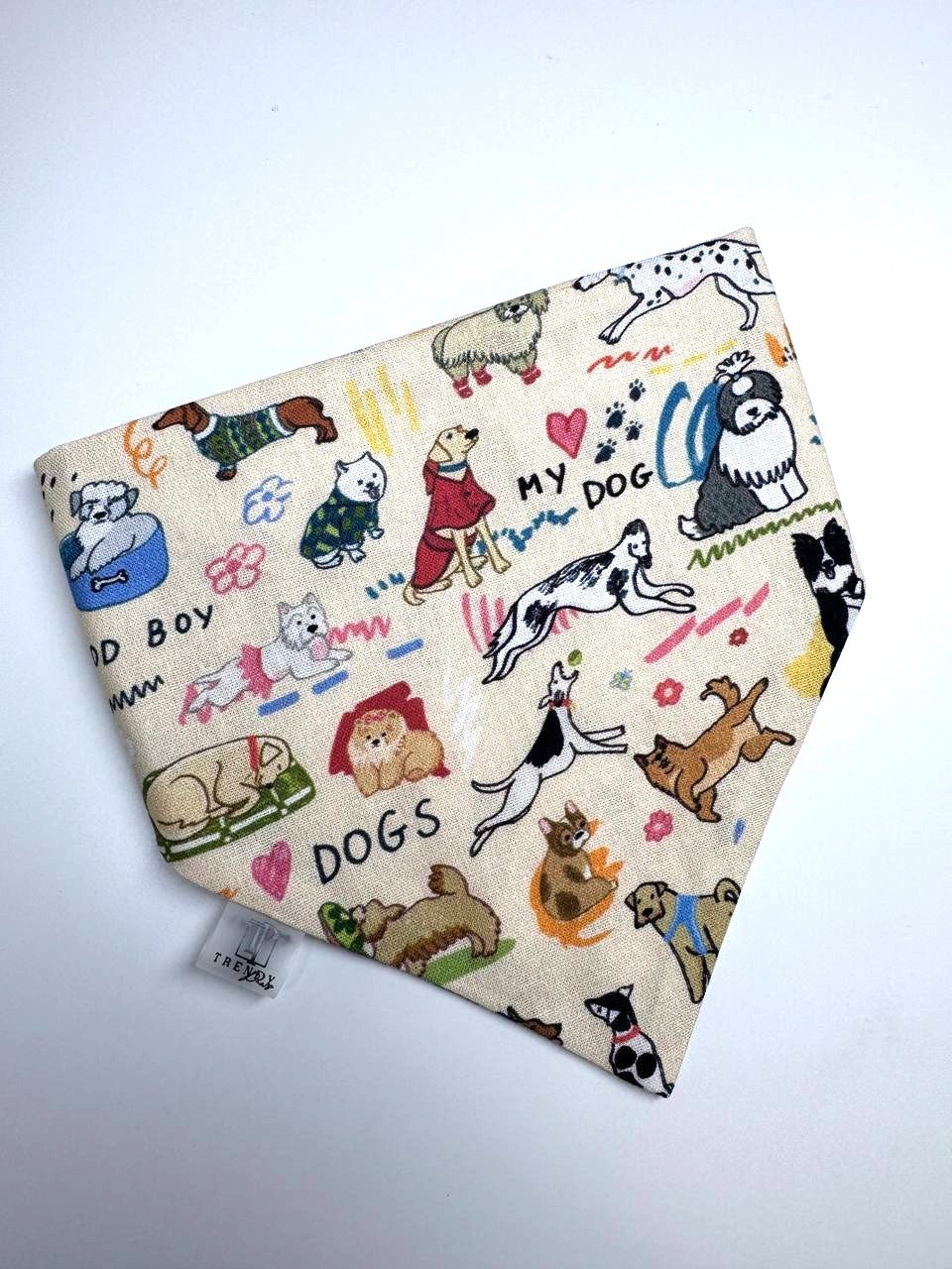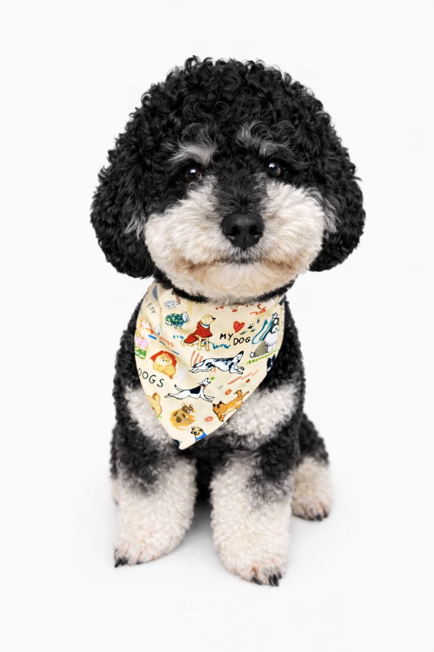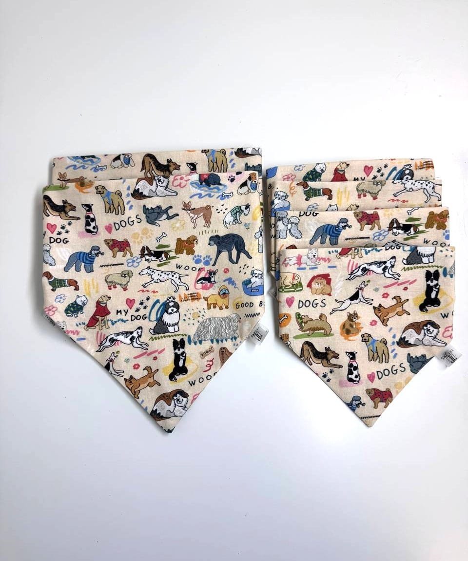 Rankų darbo medvilninė bandana šuniui „My Dog“  su žaismingu šuniukų raštu.