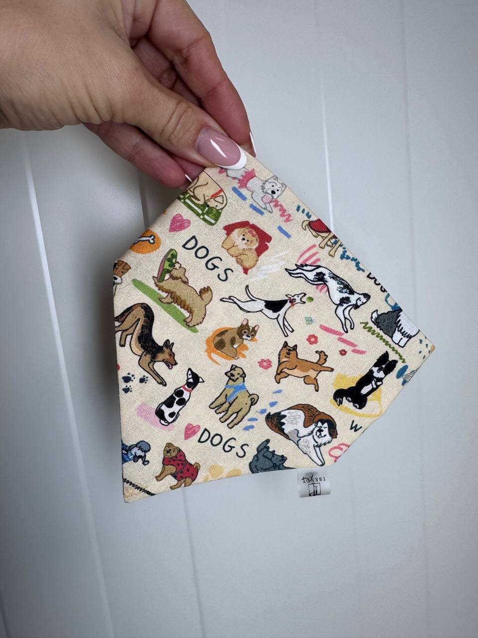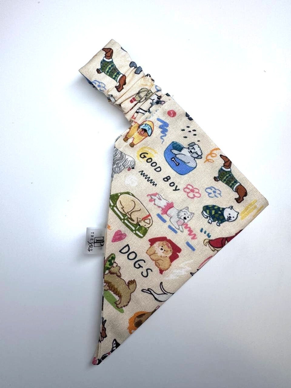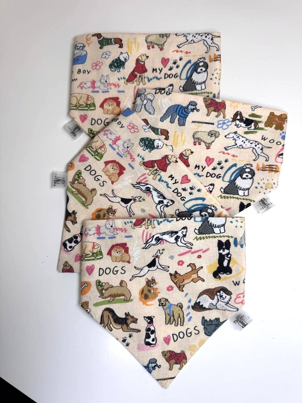 Rankų darbo medvilninė bandana šuniui „My Dog“  su žaismingu šuniukų raštu.